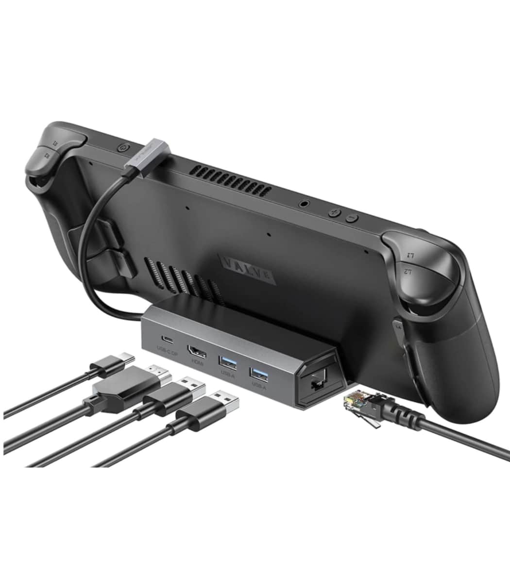 The single USB-C jack is multi-purpose: used for charging, peripherals, or even throwing the game onto a big screen at the same time. Any USB-C hub can be used to expand your options, or get our Steam Deck Docking Station when it is released.